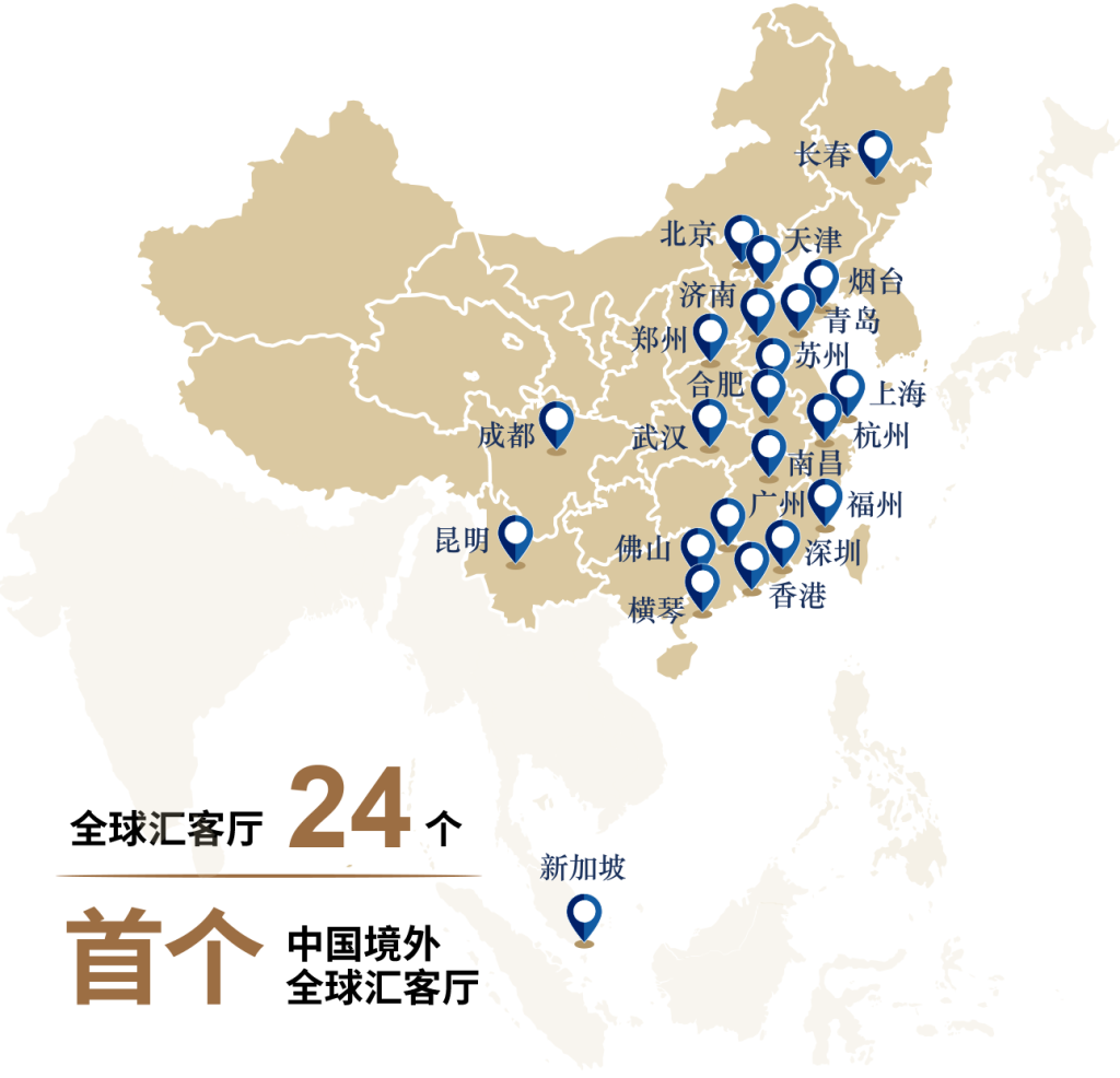 中国太平保险集团在全球拥有24个“中国太平全球汇客厅”,为高净值客户提供私密的商务洽谈及社交聚会场所。2023年, 我们在新加坡开设了首个位于中国境外的“全球汇客厅”,彰显了我们对新加坡市场的重视,以及为中国太平尊享会员保障财富福祉的坚定承诺。