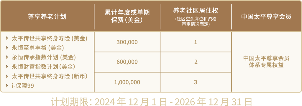** • 乐享家计划(以下简称“计划”)申请日期不得晚于2026年12月31日, 且须于2024年12月1日至2026年12月31日(含首尾两日)期间递交至中国太平保险(新加坡)有限公司(以下简称“CTPIS”)。 • 保单申请及签发须在计划期限内完成。 • 第一年的保费总额以保单的原始年度保费为准,不包含任何保费折扣或回扣。 • 适用汇率为 1美金 =1.36新币。 • 如欲兑换养老社区居住权,客户须通过 CTPIS 提交申请。 • 养老社区居住权目前仅限中华人民共和国公民申请。 养老社区的居住费用可能有所不同。• 本计划不可与CTPIS 推出的其他促销活动同时使用,除非 CTPIS 自行决定允许例外。 • 关于本计划的所有事宜, CTPIS 的决定为最终决定并具有约束力。 CTPIS 保留权利可全权酌情决定随时更改条款及条件、 撤销或使用其他项目替换本计划, 恕不事先通知。 • CTPIS 对您参与本计划的相关事宜不承担任何责任, 无论根据合同法、 侵权法或衡平法。 根据所选的具体养老社区,将适用相关太平集团实体制定的进一步条款及条件。