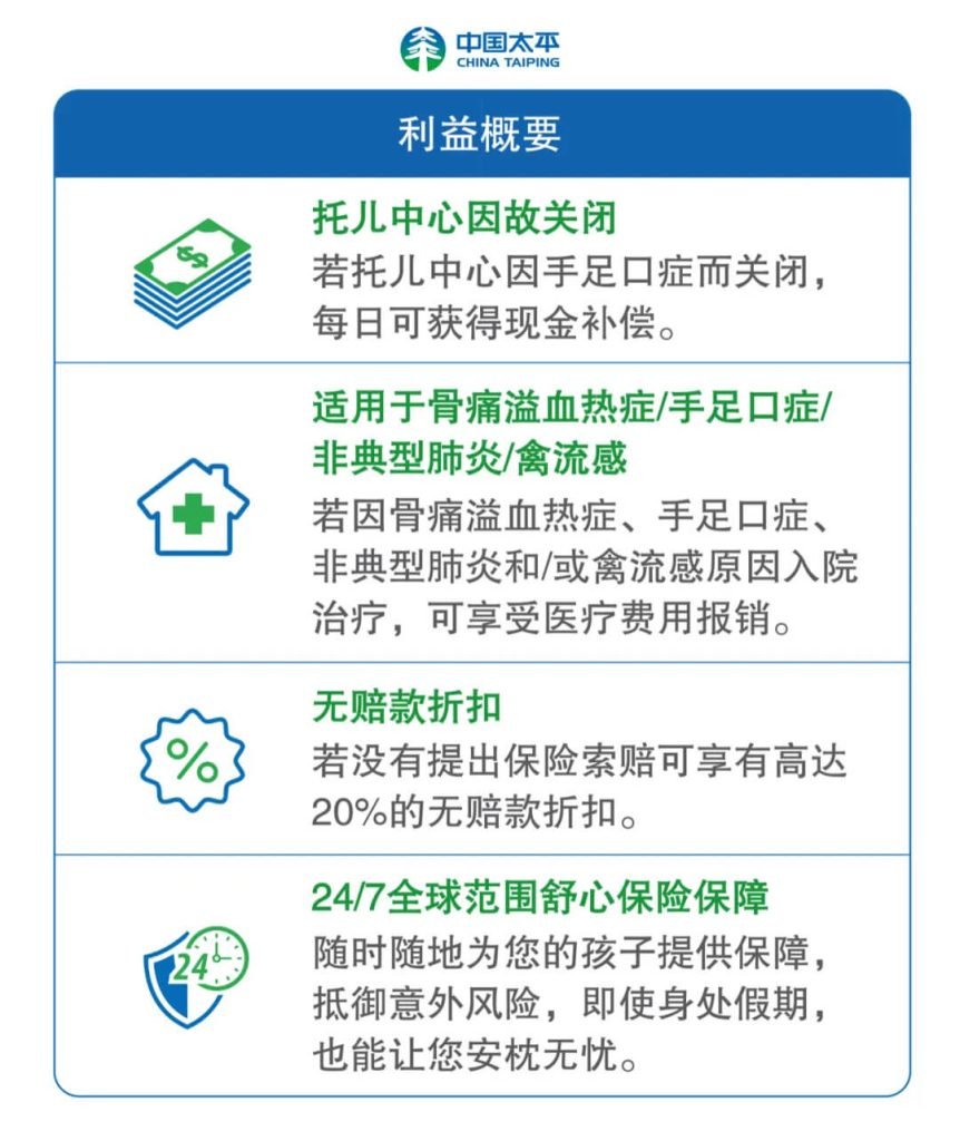 太平新加坡“少年儿童保险”(Panda Safe)专为儿童设计,可保障孩子的安全,抵御人身意外、流行性疾病及其他众多保障,随时随地呵护您孩子的安全。