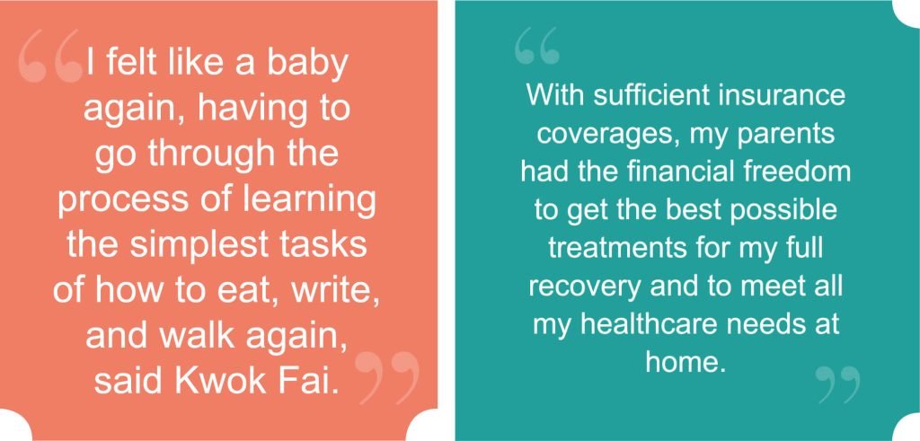 A Life Insurance actuary by profession, Kwok Fai knew the importance of being prepared for any eventuality. He took good care of himself and stayed healthy and fit; and he invested in Life Insurance policies with Critical Illnesses (CI) coverage. At the young age of 29, the last thing he expected was to suffer from a hemorrhagic stroke and to undergo emergency brain surgery.