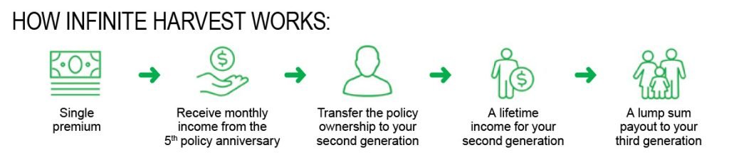 A life insurance plan like China Taiping Insurance (Singapore)’s Infinite Harvest (III) (see below) can be a source of continuous monthly income for the second generation. When they turn 18, the policy can be transferred to their name, ensuring that they can be supported for life, even when you can’t physically be there for them.